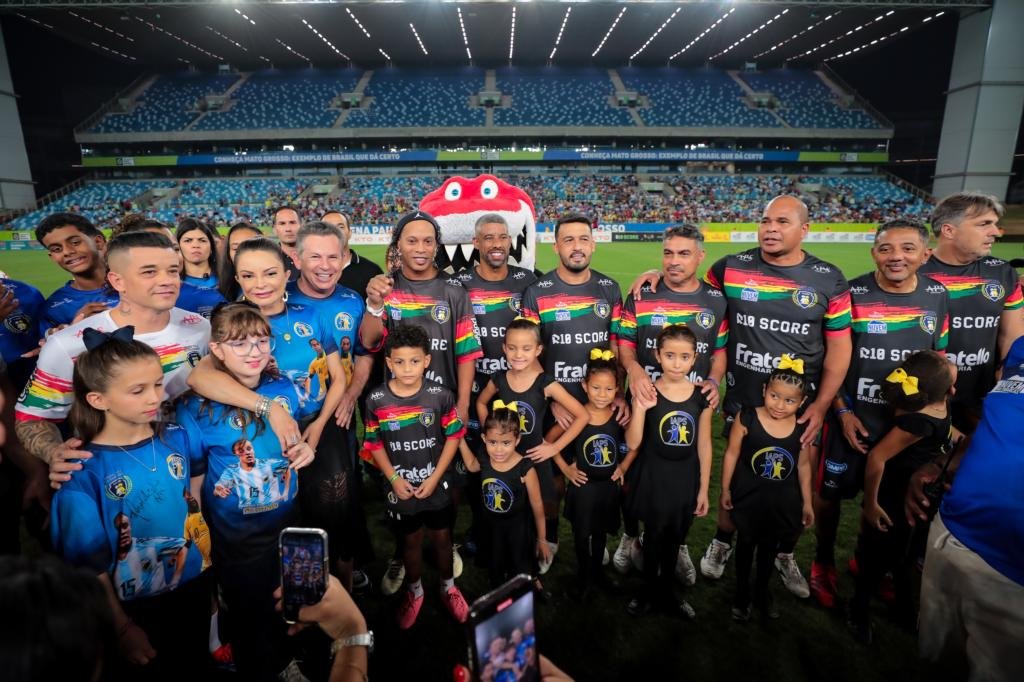 O aposentado dos gramados e eleito duas vezes pela FIFA como o melhor jogador do mundo, Ronaldinho Gaúcho, recebeu a madrinha do evento, Virginia Mendes, o governador Mauro Mendes, a filha do casal, Maria Luiza, e a amiga Olívia, antes da partida. Ronaldinho comentou: “Agradeço pelo carinho e pela recepção. Contem sempre com a gente”.